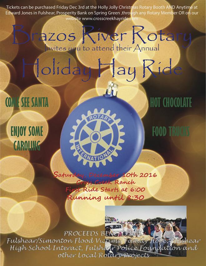 The first rides will set out from the Cross Creek Ranch Welcome Center, 6450 Cross Creek Bend Lane, beginning around 6 p.m. and then depart every 20 minutes until 8:30 p.m. Tickets purchased through Dec. 8 are $7 for adults and $5 for children. Beginning Dec. 9, tickets will cost $10 for adults and $7 for children. All proceeds benefit community and international projects of the Rotary Club of the Brazos River.