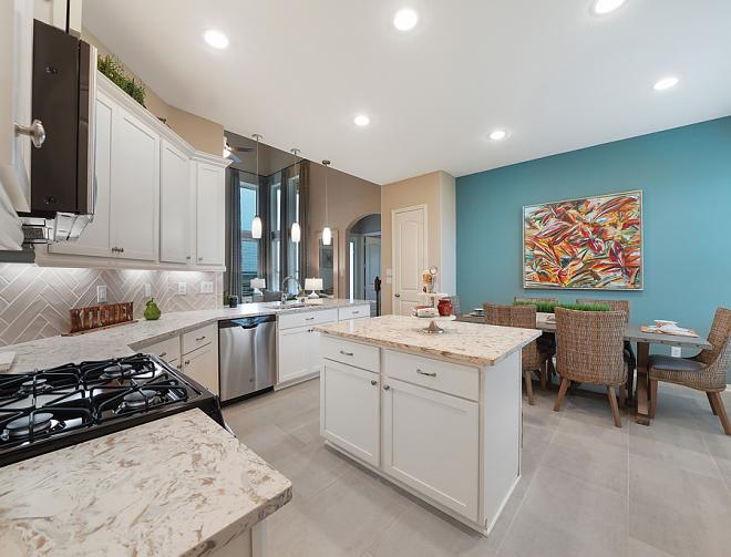 There’s a lot to love about this model home such as the trendy colors, high ceilings, oversized windows and gorgeous tile flooring, but we are particularly enamored with the kitchen. Open to both the formal dining room and the breakfast nook, the space can easily meet and exceed both your formal and informal entertaining needs. An island and a breakfast bar with counter seating are perfect for after-school snacking and wine-and-cheese parties.