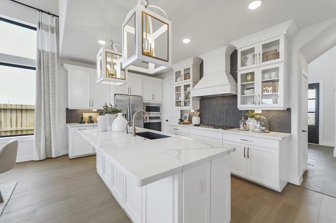 Additional options featured include a home office in lieu of the formal living room and an extended patio. Glass-fronted kitchen cabinets and upgraded countertops are also showcased.